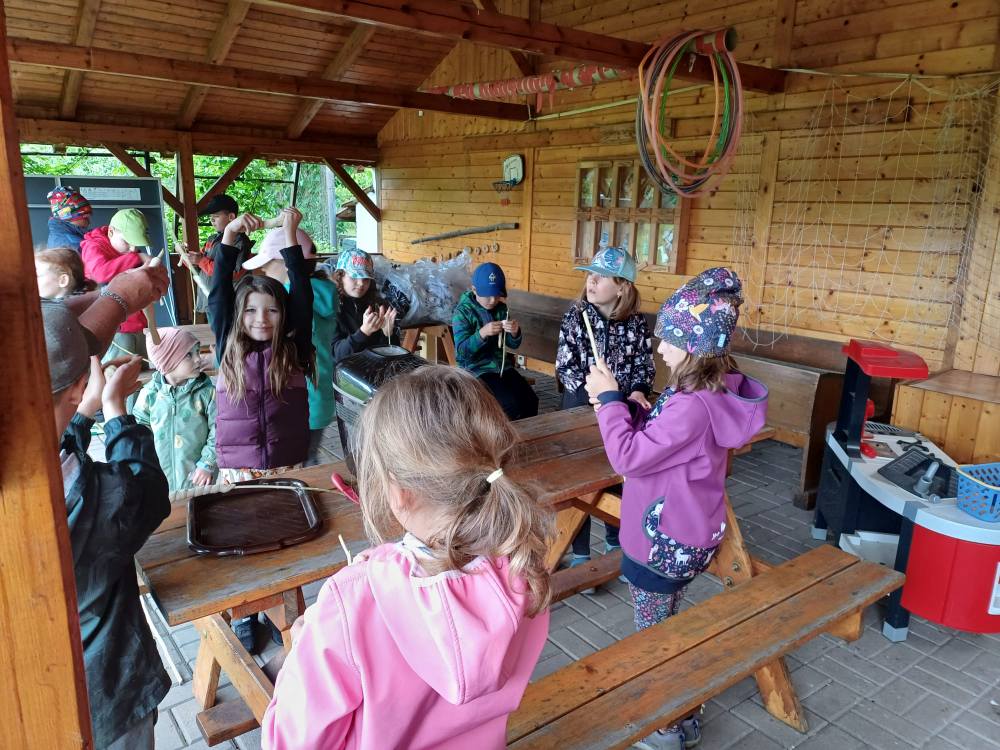 Připravili jsme si klacky na opékání, došli do lesa na dříví na oheň a umíchali těsto. Pak už jenom namotat na klacek a opéci, byla to dobrota.